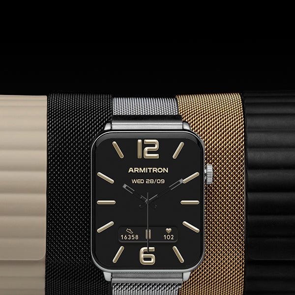 The Mesh Band is crafted from electroplated stainless steel mesh, offering a sleek, sophisticated look that subtly elevates your style. This band is designed for a secure fit and is available in black, gold, or silver. Its magnetic closure stays in place all day—no buckle is needed. Combining premium style with dependable functionality, it’s the perfect way to express your individuality while keeping your Armitron Connect Smartwatch securely on your wrist.